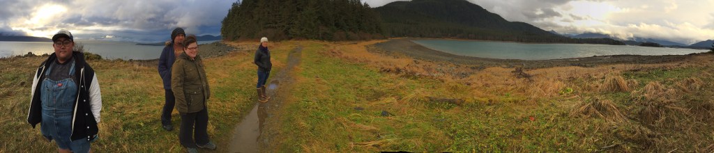 We all met up at Gonzo’s in midafternoon, and packed into Kolene’s car. It’s a lot nicer than mine. We rode over to Auke Rec to go on a short walk to a point. Everything was too dry. The forest should’ve been blanketed in snow by now. But it was a nice walk. The wind had a wonderful conversation with the trees. A dog who was overjoyed to be alive repeatedly visited us for five seconds and ran away into the forest.