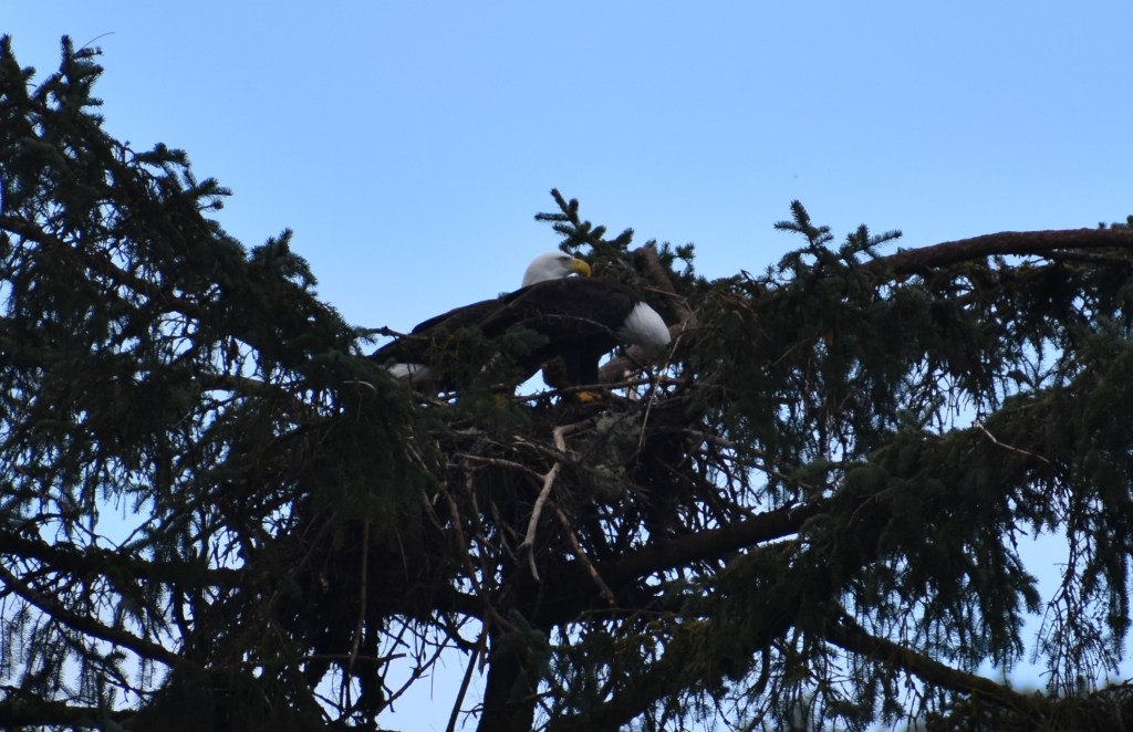 With a lot of chatter, some of our resident bald eagles are hard at work along Statter Harbor. If you’re down at the Anderson Building, look out to the right as you enter the building. You’ll see a pair of eagles currently nest building, or maybe even brooding an egg by the time of reading.