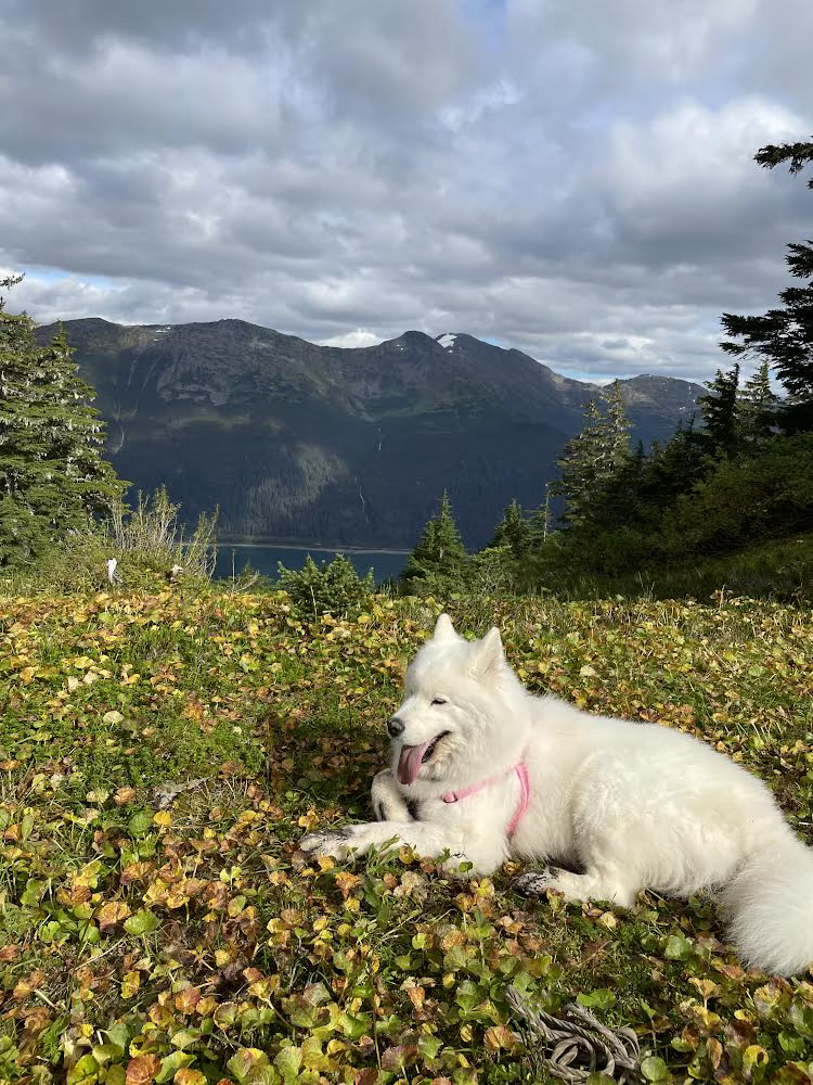 One of the most famous figures on the UAS Juneau Campus (second only to Spike the Whale) is Mavis, a 9-year-old cardiac alert service and emotional-support dog who often accompanies owner Grace Igel to class and work at Spike’s Cafe. Prior to her service-dog career, Mavis was an AKC show dog, and the mother of a litter of puppies. When she’s not on the job, Mavis loves yoga, hiking, and balled-up socks.