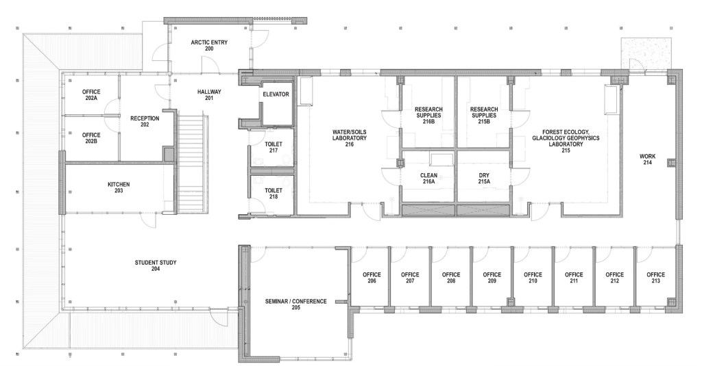 The main entrance leads to a study lounge featuring floor-to-ceiling windows. On the right are two offices and a kitchen. The hallway on the left holds a conference room, eight faculty offices, the water/soil laboratory, and the forest ecology, glaciology, and geophysics laboratory. A field research staging area, freezers, and a scuba room with wet and dry areas are downstairs. The lower entrance opens directly to the beach, facilitating direct water access. The lower floor also contains the building’s only classroom, which seats approximately 40 students.