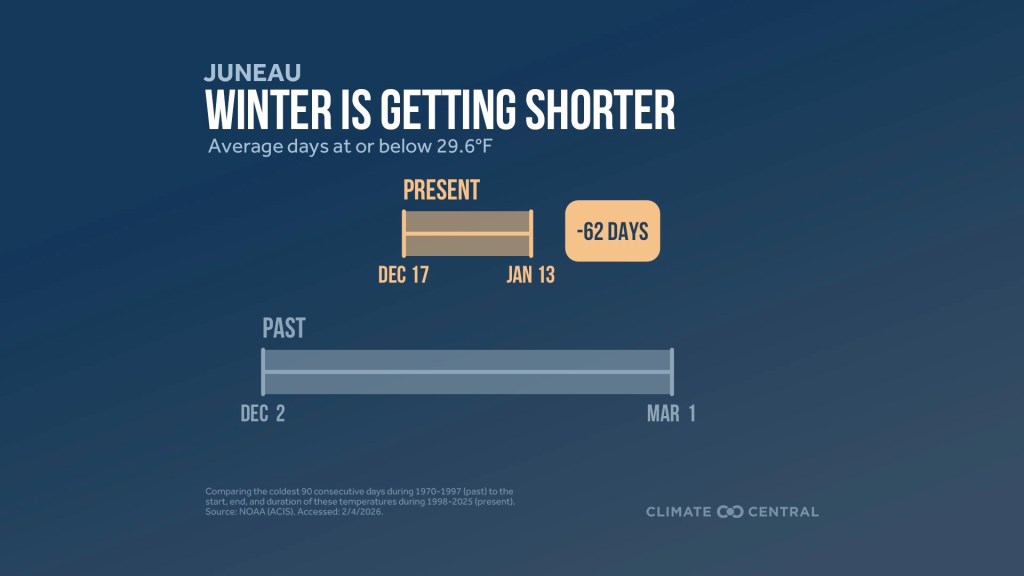 Juneau’s “winter threshold” in the study was 29.6 degrees, representing the average temperature during a 90-day period between Dec. 2 and March 1 during the 1970-1997 study period. That 29.6-degree average only lasted 28 days in Juneau during the 1998-2025 study period.